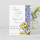 Amalfi Positano Vietri blue Majolica tiles lemons wedding editable photo template save the date invitation instant digital download, Mediterranean themed blue white and yellow tiles with bunch of citrus with lemons and blooms in blue ceramics vase wedding save the date invitation cards