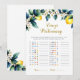 Bring the laughs with this Amalfi Lemon Emoji Pictionary Baby Shower Game Card! Guests guess baby-related phrases, items, or books from clever emoji clues, all beautifully framed by a watercolor lemon wreath of bright yellow citrus, green/blue leaves, white blossoms, and gold accents — channeling the joyful energy of Positano terraces and Mediterranean Italian style. Includes answer key for easy hosting!
