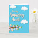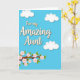 This card features a large central message that reads “For my Amazing Aunt” in creamy beige lettering with a warm outline and a soft shadow that makes it stand out. Behind the words, a bright cyan-blue background feels like an open spring sky, giving the design an airy, affectionate mood ❤️. Near the top, three rounded white clouds float across the upper area with gentle shading that adds depth without distracting from the message. A flowering branch curves in from the lower left, like a quiet offering being extended toward someone special. The branch is deep brown and dotted with small five-petal blossoms in pale pink, each with a sunny yellow center, suggesting a tender closeness. Fresh green leaves cluster around the flowers, balancing the composition and framing the text without covering it 🌼. The message sits centered while the clouds hover above and the blossom-covered branch rises diagonally from the bottom left toward the middle.