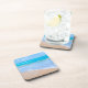 Coasters with a photograph of a clear blue ocean scene with gentle waves along a seashore and soft brown sand. A blue sky with fluffy clouds off in the distance. Serene tropical idyllic seascape.