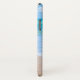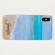 A personalized phone case with a photograph of a clear blue ocean scene with gentle waves along a seashore and soft brown sand. A blue sky with fluffy clouds off in the distance. Serene tropical idyllic seascape.