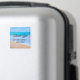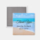 A wedding thank you magnet with a photograph of a clear blue ocean scene with gentle waves along a seashore and soft brown sand. A blue sky with fluffy clouds off in the distance. Serene tropical idyllic seascape.