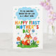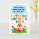 This card features a bright digital illustration on a white background, with a soft blue cloud shape near the top holding the message “AN AMAZING DAUGHTER-IN-LAW & A GREAT MOM” in dark lettering. Just below, “HAPPY FIRST MOTHER’S DAY” is centered in large all-caps letters, with each letter in a different color like red, orange, green, and blue, giving it a cheerful, caring energy ❤️. In the lower section, a cute fox-like woodland animal in warm orange and cream sits facing forward, its gentle smile and wide eyes suggesting a sweet, supportive bond. Around it, a grassy strip spreads across the bottom, dotted with simple flowers in pink, orange, blue, and yellow that feel like little gifts being offered 🌼. Small star shapes are scattered around the open background, adding a light sparkle without crowding the design. The text is stacked in two clear sections—cloud message above and the larger greeting below—so the words read easily at a glance. The fox-like character rests among the flowers on green grass, with tiny stars sprinkled across the white space above.