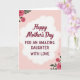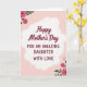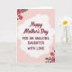 This Mother's Day card features a soft pastel pink background with a cloud-like frame centered on the front, giving the message a gentle, hugged-in feeling ❤️. Pink roses and deep green leaves decorate the corners, forming a romantic border that feels like a bouquet arranged for someone special. In the middle of the cloud frame, the words “Happy Mother’s Day” appear in flowing deep maroon lettering, placed as the main headline. Just beneath it, “FOR AN AMAZING DAUGHTER WITH LOVE” is set in a simple, easy-to-read all-caps style in the same maroon color, aligned neatly under the first line. The contrast between the tender pink backdrop and the darker text adds a quiet intensity, like a warm look shared between close family or friends 🌼. Subtle layered edges around the cloud shape add depth, as if the message is resting on a soft cushion. The roses sit at the top-left and bottom-right corners with scattered leaves curling inward toward the centered wording.