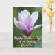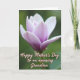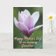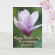This design shows a soft-focus close-up of a blooming flower centered on the card, with petals opening in a gentle gradient from deep lavender near the middle to creamy white at the curled tips. A misty green background fades into a smooth blur, letting the blossom feel like it’s floating in a quiet garden moment. The light falls softly across the petals, creating a tender sheen that makes them look freshly kissed with morning dew, like a quiet gesture of care ❤️. A slender green stem peeks in below, grounding the flower while keeping the scene airy and calm. Near the bottom, the message “Happy Mother’s Day to an amazing Grandma” sits neatly beneath the bloom in flowing lettering, filled with a warm brown tone and edged with a slightly darker outline for clarity. The spacing keeps the text easy to read without crowding the flower, and the gentle contrast adds a cozy, affectionate touch 🌼. The lavender center and pale tips are the most eye-catching details, framed by the soft green haze behind them.