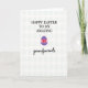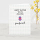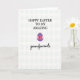 This card sits on a bright white background with a subtle pattern of pale, cool-toned egg shapes arranged in a neat grid 🌷. Across the top, uppercase black text reads “HAPPY EASTER TO MY AMAZING,” spaced evenly and centered for a steady, affectionate feel. In the middle, a deep purple egg illustration takes center stage, like a little gift placed between loved ones 🐰. Two soft pink horizontal bands wrap around the egg, and a neatly tied red bow at the front adds a sweet, caring touch. Beneath the illustration, the word “grandparents” appears in flowing black cursive-style lettering, giving the layout a gentler, more intimate contrast to the stronger lines above. The mix of sharp uppercase letters and the softer letterforms below suggests a warm closeness, like a tender note tucked into a holiday table setting. Behind everything, the faint egg silhouettes remain light and airy, forming a quiet backdrop that doesn’t compete with the main purple egg and red bow. The purple egg is centered between the top black message and the lower “grandparents” line, with the pink bands and red bow aligned across its middle.