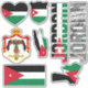 Amazing Jordan Shapes National Symbols Sticker. Two country name stickers, one in the colors of the national flag and the other one covered in the Word Cloud with the words "Jordan" written in the different alphabet forms and/or languages and fonts. All words are colored with the national colors used on the flag of Jordan, Beautiful heart, shield (escutcheon) and map filled with the representation of the Jordan national flag. Hand sticker with the two fingers up, representing victory filled with the colors of the Jordan national flag. The last two stickers are national flag of the Jordan and the national Coat of Arms. This is the great set of superb stickers with most of them unique and hand drawn. All stickers are fully customizable using "Customize it!" feature. You can mix and match them as you wish. If you want multiple hearts but no shield fire away. Maybe you want only hand with the victory sign? Easy, remove everything else and make multiple copies of the hand. These grand stickers are the perfect sticky gift for any occasion. Fire away and stick them where your heart desire! © 2022 CountriesOfTheWorld