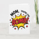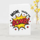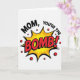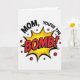 This greeting card features a bright pop-art style burst on a white background, like a comic-style flash that feels like a big affectionate shout. At the center, a jagged starburst in yellow and orange radiates outward, drawing the eye in with energetic warmth ❤️. Inside the burst, the word “BOMB!” appears in large red letters with thick black outlines, giving it a punchy, celebratory look. Above it, “MOM, YOU’RE THE” curves in black lettering, framing the burst like a cheerful banner. The strong red, sunny yellow, and deep black palette creates a confident, friendly tone, like a fun compliment shared with a grin. Around the main burst, small red circles outlined in black are scattered like confetti, adding extra rhythm and motion 🌼. The overall layout keeps the text centered and stacked, with the curved top line guiding you down to the big red word. The edges of the burst are sharp and spiky, and the surrounding dots vary slightly in size across the white space.