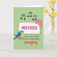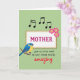 This card centers on a white rectangular panel edged with a shiny golden border, creating a cozy frame for the message ❤️. The word “MOTHER” sits prominently in rich magenta near the top of the panel, like a proud headline. To the left, a small bird with blue and sunny yellow feathers perches on a thin brown branch, angled inward as if singing to her with gentle affection. Just above the framed panel, three black musical notes float upward, adding a light, friendly rhythm to the scene. On the upper right corner of the golden frame, three fuchsia flowers with soft yellow centers lean in, like a sweet little bouquet offered with care 🌼. Beneath the main word, a smaller line of text in neat black lettering reads, “JUST A LITTLE NOTE TO SAY I THINK YOU’RE,” followed by “amazing” in curved red letters near the bottom. The background is pastel green with fine diagonal stripes in a lighter green running across it.