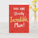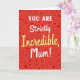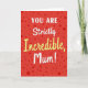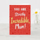 The front design shows a rich red background sprinkled with darker red dots in different sizes, like confetti floating around a sweet message ❤️. Centered in the middle, the words “YOU ARE” sit at the top in white, all-caps lettering that feels direct and upbeat. Just below, “Strictly” appears in smooth white cursive, adding a softer, more affectionate tone, like a gentle hand squeeze between close family. The largest word, “Incredible,” stretches across the center in warm yellow cursive, giving the layout a sunny lift 🌼. A small golden five-point star replaces the dot over the “i,” adding a tiny sparkle that reads like a proud little wink. Near the bottom, “Mum!” returns to white cursive with an exclamation point, rounding out the message with a cozy, caring finish. The white and yellow text stands out sharply against the red field, while the scattered dots frame the lettering without crowding it. The star sits just above the yellow word’s “i,” shining against the red backdrop.