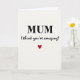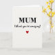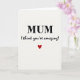 This card features the large word “MUM” centered near the top in dark, all-capital serif lettering on a soft off-white background. Just below it, the line “I think you’re amazing!” appears in a thinner, flowing handwritten style, adding a gentle, affectionate tone ❤️. The contrast between the sturdy top word and the lighter line underneath creates a sweet, respectful balance, like a warm compliment spoken softly. Plenty of open space surrounds the text, keeping the layout simple and easy on the eyes. The message reads clearly from top to bottom, with the darker text drawing you in first and the lighter line feeling like a tender follow-up. A single red heart sits centered beneath the words, offering the only strong color in the design 🌼. The heart is a rich crimson shape placed in the lower half, directly under the text.