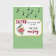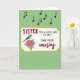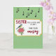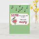 This card features a bright digital illustration centered on a white rectangular panel outlined with a sparkling gold-glitter border. Large red lettering near the top reads “SISTER,” drawing the eye right away, while smaller black text below says “JUST A LITTLE NOTE TO SAY I THINK YOU’RE,” leading into the word “amazing” in red, flowing lettering for a softer, affectionate emphasis ❤️. In the lower left of the panel, a small bird with blue, yellow, and black feathers perches close to a lush cluster of rose-pink flowers, as if lingering in a gentle, friendly moment. The mint-green background is patterned with tiny gold arrow-like shapes that add texture without taking over the scene. Above the framed message, a few black musical notes drift upward, like a light tune floating through the air 🌼. The mix of strong red title text and quieter black lines creates a sweet rhythm across the layout, guiding you from top to bottom. The bird sits just beside the flower petals, with the black notes hovering above against the mint background.