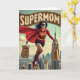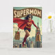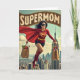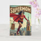 This design shows a smiling woman flying high above a busy city, her body angled upward as if she’s rushing home to someone she cares about ❤️. She wears a deep red long-sleeved tunic with a gold emblem on her chest, a matching gold belt, red boots, and a flowing red cape that streams behind her in the wind. A simple black eye mask keeps her look classic while her relaxed expression feels warm and approachable. In each hand she carries a plain brown paper shopping bag, and the everyday groceries—green broccoli, red berries, and even colorful yarn—add a sweet, caring contrast to her heroic outfit. The sky is bright blue with a few soft white clouds, giving the scene an airy, open feeling. In the upper left, an arched banner reads “SUPERMOM” in light-colored letters on a dark background, standing out clearly above the action 🌼. Below her, countless buildings stretch into the distance, and a tall spired landmark rises on the right side of the skyline.