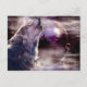 Truly Unique Wolf Song postcard featuring a stunning wolf howling a song, in the background is lightning from the skies and a silhouette of a wolf on the mountainous terrain