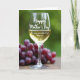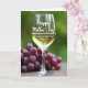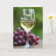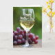 This greeting card features a clear stemmed glass glowing in soft daylight, with warm amber liquid catching the light as it curves along the bowl. The glass rests on a rustic wooden surface, giving the scene a cozy, down-to-earth setting that feels like a quiet moment shared with someone you care about ❤️. In the background, a lush green field fades into a gentle blur, like an outdoor garden or vineyard where close conversation lingers. At the lower left sits a clustered bunch of deep burgundy grapes, slightly out of focus, adding rich color and a relaxed, companionable mood. White lettering is placed directly on the glass, centered and easy to read, with the message “Happy Mother’s Day To my wonderful Niece!” standing out against the warm tones. The bright highlights on the rim and stem contrast with the softer background, creating depth and a calm, affectionate atmosphere 🌼. The grapes show rounded shapes with subtle shine, and the green backdrop dissolves into smooth, soft-focus patches behind the glass.