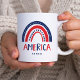 This cute, modern mug features a colorful red, white, and blue rainbow with hearts, and says "America" in trendy hand-written text. This cool holiday design is perfect for Independence Day on the 4th of July.