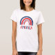 This cute, modern shirt features a colorful red, white, and blue rainbow with hearts, and says "America" in trendy hand-written text. This cool holiday look is perfect for Independence Day on the 4th of July.
