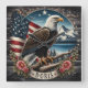 A majestic bald eagle stands on a tree branch, overlooking a serene mountain lake adorned with an American flag and floral accents in the background.