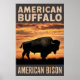 A silhouette of an American bison standing in a field against a vibrant sunset sky.