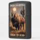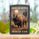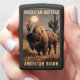 A lone American bison stands in a desert landscape under a setting sun, surrounded by cacti.