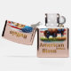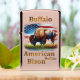 American Buffalo Bison in the bronze color .Eating grass in a field with a American flag behind him. text declaring "American Buffalo Bison, Let this entertaining humorous fun design do the talking for you.