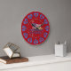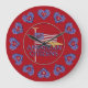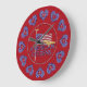 American Citizens Round Wall Clock - The background of this clock is a lightly textured royal red color. The center is a round red piece with a glittered USA flag and a gold eagle emblem. Text in the center reads AMERICAN CITIZENS and is created with blue glitter. The numbers on this clock are white and sit in a tiny red heart that rest on big blue hearts.