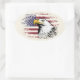 Sticker with stylized illustration of bald eagle head against USA flag background.
