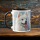 This bright and colorful mug celebrates the American Eskimo dog! Two sides of the mug have a beautiful portrait of an Eskimo dog against a blue winter sky. At the center is script that says American Eskimo Dog, but you may change it or even personalize it, if you wish.