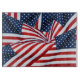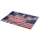A photograph of the American flag waving in the gentle breeze. The flag image has been placed in a layered design layout for this cutting board.
