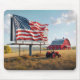 A large American flag billboard stands prominently in a golden field, alongside a red farm barn and a tractor, all set against a bright blue sky