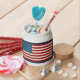 Muted tones of red, blue and cream give this American Flag canister vintage style. Use this American flag jar as a candy jar, decor, in the kitchen, etc...The design is from original art.