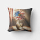 Sunlight streams through a window, illuminating a daisy with petals patterned after the American flag, positioned in a clear vase atop a table with a lace doily.