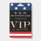 This custom VIP party pass features a patriotic American flag design with a banner of white stars over a blue background placed across the top portion, and a banner of red and white stripes across the bottom. The title "VIP" is printed in large gold text, with the date and name of the event printed above, and "all access pass" printed below. The back of the badge features a space to add your own custom text or addition event information. It's perfect for parties, fundraisers, a concert, or other special event.