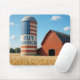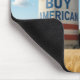 A large cylindrical silo boldly painted with an American flag and the words 'BUY AMERICAN' stands prominently beside a classic red barn