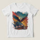 This vibrant and dynamic artwork depicts a powerful bald eagle soaring above an American flag, set against a backdrop of bold colors and abstract brushstrokes. The image evokes a sense of patriotism, freedom, and national pride.