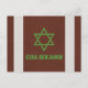 Brown, green, black, and white American football Bar Mitzvah personalized thank you postcard. This American football Bar Mitzvah thank you postcard design features a brown leather dimpled background that looks like the leather of a football on the front. There are also two vertical white stripes similar to what are found on a football ball as well. This brown and white football ball background is paired with a sports style accent font and a Jewish Star of David in green. This football Bar Mitzvah flat thank you postcard would work well for a NFL football or Super Bowl themed Bar Mitzvah. This football sports Bar Mitzvah thank you card could work for any season and is a great choice for a boy who loves American football.