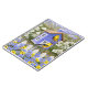 A pair of American Goldfinches perch on a cute purple birdhouse in a beautiful spring garden filled blue and yellow daisies lining a white picket fence. In the background is a lovely jacaranda tree covered with purple blossoms, surrounded by flowering dogwood. Original artwork created by wildlife artist Crista S. Forest.
