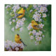 A pair of male and female North American goldfinches sit on the branches of an apple tree covered with pink spring blossoms while a third goldfinch perches on the edge of a woven wooden basket filled with freshly picked flowers. Realistic artwork created from an original oil painting by wildlife artist Crista S. Forest.