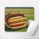 A hot dog with the word "AMERICA" written in mustard rests in a baseball glove on a sports field with a baseball nearby