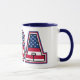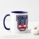 This custom coffee mug features a design that displays the word "USA" in a bold Stars & Stripes flag print font and red, white, and blue colored letters plus black outline in this pride of the USA theme. The rim & handle are glazed in matching colors available in 11-ounce or 15-ounce sizes microwave and dishwasher safe ceramic construction.