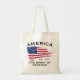 Fun classy patriotic shopping tote bag with cool red, white and blue American flag pattern design and AMERICA THE SPIRIT OF FREEDOM EST. 1776 text in classic typography lettering.