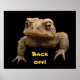 A grumpy looking American Toad (Bufo americanus) is looking out at you from this poster. This small amphibian is brown with black, gold olive green and orange coloration. His warts distinguish him from his frog neighbors. Although hatched in the water of ponds, rivers, lakes or streams, the tadpoles soon move to land where the toads live their adult lives. His startling call is a long screech. He looks quite fierce but is actually a gentle little guy who eat lots of garden pests including insects and slugs. The text reads: Back off ! It can be customized or removed.