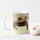 Two grumpy looking American Toads (Bufo americanus) are looking out at you from this mug. This small amphibian is brown with black, gold olive green and orange coloration. His warts distinguish him from his frog neighbors. Although hatched in the water of ponds, rivers, lakes or streams, the tadpoles soon move to land where the toads live their adult lives. His startling call is a long screech. He looks quite fierce but is actually a gentle little guy who eat lots of garden pests including insects and slugs. The text reads: Bring It On! It can be customized or removed.