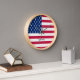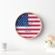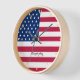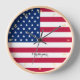 The all American, Stars and Stripes, Old Glory, Star-Spangled Banner, USA flag, custom, personalized, acrylic round wall clock with high-impact plexiglass crystal face and natural wood frame, for your room, home, office, to show your pride, patriotism, love. To customize, simply enter your name / family name / company name or your initials / monogram. Great home & office decor for Independence Day 4th of July parties, Memorial Day celebrations, armed forces celebration, and more. Makes a great patriotic gift for fathers day, birthday, wedding, independence day, memorial day, anniversary, christmas, holidays, and more, for your loved ones, mom, dad, brother, sister, son, daughter, husband, wife, bride, groom, grandpa, grandma, family and friends.