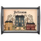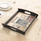 Americana Folk Art style serving tray, with colorful graphics of houses, trees, and sheep. Personalize the name at the top of the tray for yourself or as a charming gift idea.