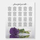 This gorgeous wedding seating chart has places for 200 guests at 20 tables - 10 seats per table. The design is simple yet elegant with a lacy script calligraphy title and a single long stemmed amethyst purple colored rose reflecting in a pool of water with waves and ripples. There is space for the names of the couple and the wedding date. Beautiful way to help your guests find their seats at your wedding reception.
