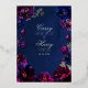 A stunning amethyst purple, sapphire blue and navy blue jewel tone wedding invitation in silver foil, featuring a symphony of deep purple, lavender, plum, burgundy and raspberry pink red peonies adorned with silver spray and shimmering silver outlines on a navy blue watercolor-wash background with your names in silver foil rustic script and a small uppercase non serif font announcing your details. The back is not silver foil and has your first and last names beautifully laid out and centred.