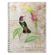 Personalized spiral notebook with a vintage illustration of the Amethyst-throated Sunangel hummingbird - a green hummingbird with a red-violet throat perched on a tropical plant with pink flowers, on an off-white vintage grunge background with gold swirls and floral silhouettes. Great for use as a dream journal, gardening record book or reflective writing. Perfect gift for hummingbird lovers and nature enthusiasts.