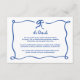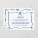 These chic and elegant wedding guest information and detail cards feature a hand drawn, wavy illustrated frame in marseilles blue with a bow on a white background, and stylish handwritten script for a Parisian or French style wedding look. They also feature a scannable QR code for your wedding website.