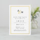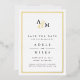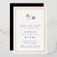 Simple and elegant save the date cards notify your guests of your upcoming wedding in timeless style. Crisp black and white cards with gold foil accents feature your initials worked into a monogram design, joined by a calligraphy script ampersand. "Save the date" appears beneath, with your names, wedding date and location beneath.